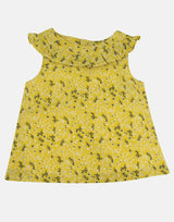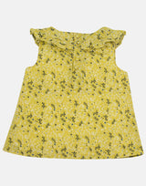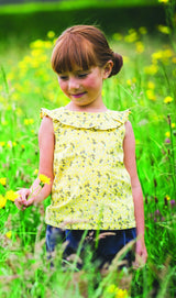 The Betsy sleeveless blouse in our unique print in soft yellow with navy, blue & white flowers. This fully lined blouse has round neckline with a pleated edge collar and is fastened with a partial button back.