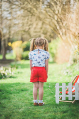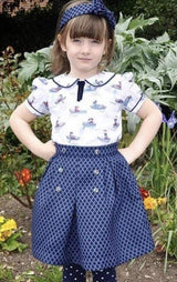 The Henrietta white boat print is unique to Little Lord & Lady and to this season, creating a limited edition blouse with sweet puff sleeves and a Peter Pan collar, this blouse is trimmed with navy piping for contrast. A navy tie offers a sense of style and fun. Fully lined for comfort, the blouse is a super top for any of the Henley Regatta separates. The boat print is a navy, sky blue and red sketch of a water scene in keeping with the story colourway on a soft white chiffon.