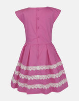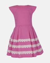 A delightful bubble gum pink for this stunning dress, with a bit of stretch in the fabric for comfort. A neat fitted body with sweet cap sleeves and round neck give the dress simplicity and grace. Flowing into a pleated skirt, trimmed with pretty lace bands, the lashings of net underskirts offer twirlability and fun. Fully lined for comfort, the dress is finished with a button back for easy changing. A beautiful dress, simple and sweet.