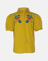 In a fabulous yellow cotton with a tiny white spot, this unique blouse, with a floral embroidery shoulder and collar trim to match the story. A neat body with short puff sleeves and a button down collar make this blouse classic and traditional. The bright embroidery in the style of this story to the neck - in colourful blooms of yellow, pink, blue and green, is unique to this season. The blouse has a full button front for easy changing.