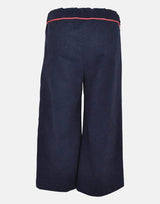 A smart pair of wide leg culottes in soft, navy baby cord. Neat at the waistband, with piping in coral to match the collection, these culottes have two hip pockets, which are lined with our unique Betsy ditsy print. The waistband is buttoned, flat to the front and elasticated to the back for easy fitting and comfort. Finishing at the calf for panache and style, these culottes are perfect for a casual day out or to dress up for a special occasion for those Little Ladies who just need trousers.