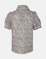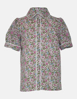 A soft pink & green ditsy print for this classic collared blouse. The Peter Pan collar, sleeve cuffs and button placket is piped in cream cotton, finished with complementary buttons. With cuffed puff sleeves creating a classic silhouette, this blouse is fully lined for comfort.