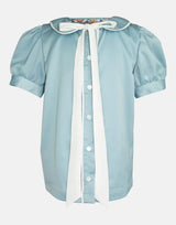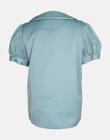 A soft pastel green satin feel for this classic bow collar blouse. The Peter Pan collar and button placket is trimmed in piped cream sateen, finished with pearlised buttons for contrast. The bow in cream chiffon drapes creating a sophisticated finish. With cuffed puff sleeves creating a classic silhouette, this blouse is fully lined for comfort.
