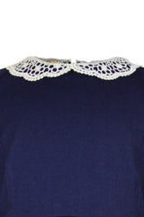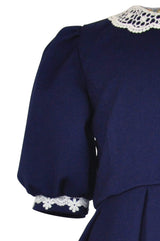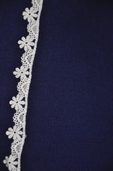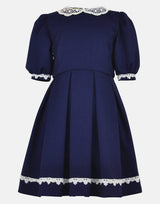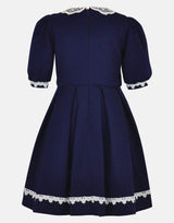 A dark blue fabric in traditional silhouette for this subtle dress trimmed in white crochet lace. A neat body, with puff half sleeves, is topped with a simple crochet lace collar. The sleeves and skirt are trimmed in a crochet lace ribbon and the box pleat skirt sits over contrast mustard petticoats for happy twirling. This dress is fully lined in cotton for comfort and has a hidden zip to the back for easy changing.