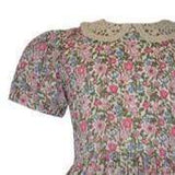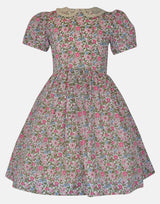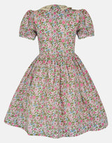 A classic silhouette in our pink & green ditsy Betsy print. A neat fitted body with short puff sleeves and lace collar give the dress traditional elegance. Flowing into a gathered skirt, the lashings of net underskirts offer twirlability and fun. Fully lined for comfort, the dress is finished with a full button back for easy changing. The dress has a complimentary headband for that British style.