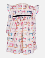 A traditional empire line for this sweet dress in our unique Eugenie sewing print. The upper body has pin tucks to the front for added detail and the line is emphasized with a navy velvet ribbon, which separates the skirt. The arms have a frill to the shoulder and a full length sleeve. A simple round neckline and full button back create easy changing. The gathered skirt is fluffed with lashings of cream petticoats to create a stunning silhouette and offer plenty of twirling. It is lined to the body and skirt for comfort in 100% cotton. This dress comes with a Eugenie bow headband, because every girl needs headwear.
