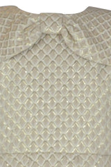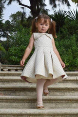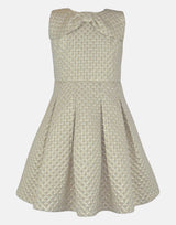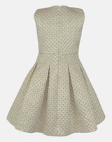 A stunning cream and gold diamond jacquard for this traditional occasion dress. The neat sleeveless body is topped with a wide shawl collar and lined and trimmed with a soft pink cotton. Our signature full pettiskirts in cream net sit under the top stitched, inverted box pleat skirt. The dress is fully lined and finished to the back with a hidden zip for easy changing.