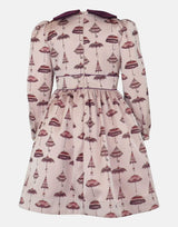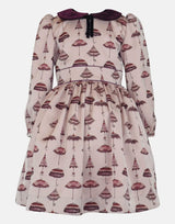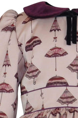 The unique vintage parasol print for this feminine and traditional dress in soft pinks and plum. A neat body with plum piped waistband, has puff long sleeves finished with a simple gold colour and pearl button to create a striking silhouette. Our signature full pettiskirts in white net blossom under the gathered skirt and the dress is fully lined. A wide plum velvet Peter Pan collar tops the body, with a neat velvet bow to the neck.