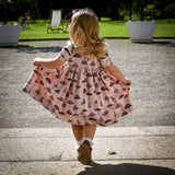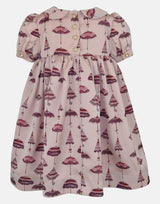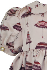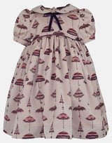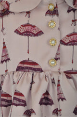 The unique vintage parasol print for this empire line traditional dress in soft pinks and plum. A neat plum piping to the high waist highlights the silhouette and the short puff sleeves are finished with a simple gold colour and pearl button to create a striking silhouette. Our signature full pettiskirts in white net blossom under the gathered skirt. A Peter Pan collar tops the body, with a neat velvet bow to the neck. To the back, the dress is fastened with gold colour and pearl buttons. The dress is fully lined.