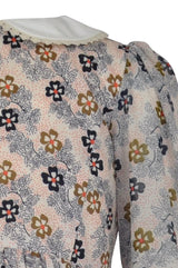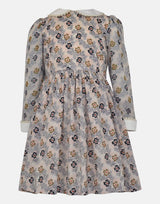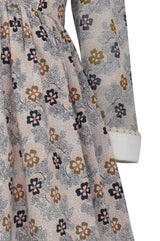 A traditional style for this sweet dress in our Primrose print. A neat body is topped with a cream, lace edged Peter Pan collar. The long sleeves in sheer Primrose print fabric are full and finished with deep cream, lace edged cuffs. Lined to the body and gathered skirt, this stunning dress is fastened to the back with a hidden zip.