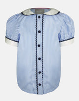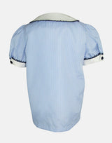 This subtle white and sky blue stripe cotton for this versatile blouse. A neat body with sweet puff sleeves, cuffed with white cotton for contrast. The cuff detail is reflected in the Peter Pan collar and trimmed in navy lace. Navy lace to the button placket and contrast navy buttons for uniqueness. This sweet blouse is fully lined for comfort.