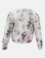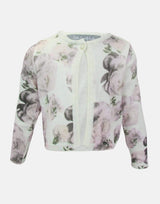 This classic white bolero boasts the striking purple and lilac blossoms of our Aria jacquard fabric in print.