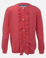 A sweet coral cardigan with unique frill to button placket and diamond pointelle detail to create a light and airy style. Details in pearlised buttons echo the traditional cardigan and add some sparkle. Simple edging to the cuffs and hem with a navy velvet ribbon trim inside to finish the classic cardigan.