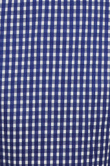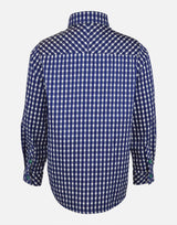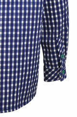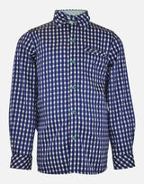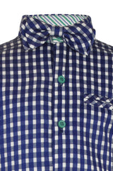 A cotton long sleeve shirt in strong navy and white check. Complete with matching bow tie, the trim is our Morgan cotton for cuff, collar and button placket, with green buttons and a discrete chest pocket for those special Little Lord necessities.