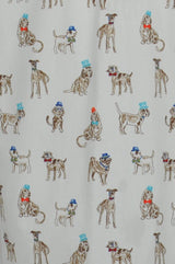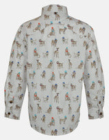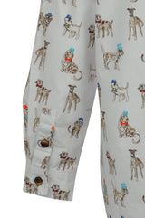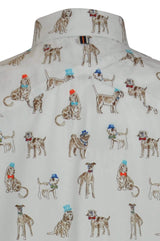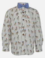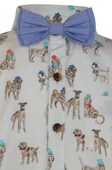 Our unique vintage hound print for this long sleeve, white cotton shirt with contrast blue bow tie. Trimmed with two tone buttons and contrast trim to cuff, collar and placket, this print is exclusively designed for this story. A definitely fun print, with colourful hounds making it versatile and handsome.