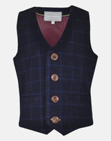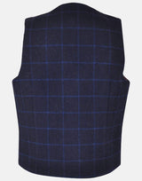 A strong navy blue tweed with a cobalt blue check for this smart waistcoat. Trimmed with cobalt piping to the inner seam and lined with a burgundy polyester. This smart waistcoat is fastened with brown buttons and has two pockets.