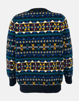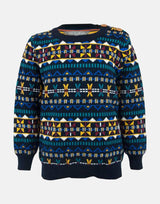 A striking traditional fairisle knitted jumper in cashmere blended cotton. Thick and ready for the cold, a mixture of colour from our stories in brick red, mustard, teal, white and blue on a navy ground.