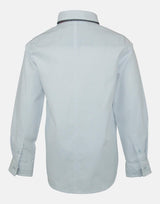 A cotton long sleeve shirt in white with a silver grey diamond pattern. Complete with maroon bow tie, with silver grey diamond pattern this smart shirt is highly versatile. The trim is a pale blue contrast fabric for cuff, collar and button placket, with navy buttons and a chest pocket for those special Little Lord necessities.