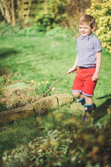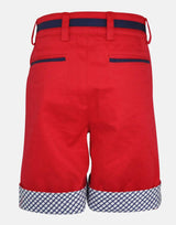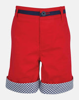 Strong red for these striking shorts, trimmed in a navy and white geometric print to the turn up and a navy band at the waist for contrast, these shorts have pockets to front and an adjustable waist to ensure a trim fit. Remember all our shorts have 3% elastane for that bit of stretch to ensure a good fit, but also to prevent tears and mis-shape from the rough and tumble of boys play.