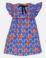 The Alya hot air balloon print is unique to Little Lord & Lady and to this season, creating a limited edition skirt in blue and orange. This sweet empire line dress is perfect for little ones with an A-Line skirt and fitted top. Trimmed with frills at the sleeve and the front, the round neck is finished with a fixed bow. Fully lined for comfort, the dress is fastened with a partbutton back for easy changing. The orange, blue and striped balloons sit on a pale blue background creating a fun eye catching print in keeping with the story colourway.