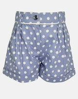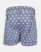 The subtle periwinkle cotton with white spot for these stylish shorts. A neat adjustable waistband for snug fit, trimmed with white cotton piping for contrast, topping these fully lined shorts. Pleats to the front give some movement and turn ups to the bottom offer a classic style.