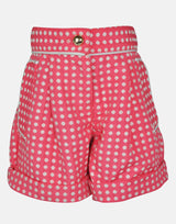 The striking fuchsia jacquard with a white spot for these sweet shorts. A neat waistband, trimmed with white piping and a contrast button atop, with box pleats and turn ups below. Finished with white piped pocket flaps these shorts are a stunning separate to this story.