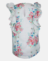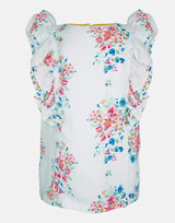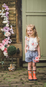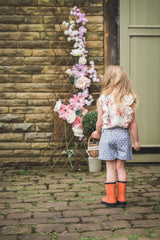 The unique floral print for this feminine cotton blouse. A neat body with a flouish of frill sleeve has a round neck and keyhole button for easy changing. Simple in design, but stunning to see, the blouse is fully lined for comfort. The Neave unique floral print is a LIttle Lord & Lady designed print, unique to this season. Large bouquets of flowers, coloured with pinks, turquoises, yellows and greens are the perfect match for any separate from the Cotswolds story.