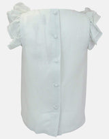 A beautiful off white fabric with silver shimmer for this sweet fully lined, slip blouse. Sleeveless with frill detail over shoulder and round neckline, the blouse is fastened with a full button placket.