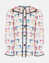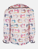 This stunning long sleeve blouse comes in our unique Eugenie sewing print. The front is pin tucked for sweetness to both sides of the navy lace trimmed button placket. The frill collar, matches the frill cuffs, which are elasticated at the wrist and both are trimmed with the navy lace edging. Lined to the body for comfort in 100% cotton, the versatile blouse can be dressed up or down.
