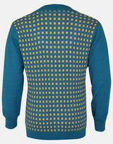 This teal, blue and mustard traditional cardigan has a quirky geometric square design. With two front pockets, with button detail and matching brown buttons to fasten this smart cardigan is the perfect match to our Harrogate collection.
