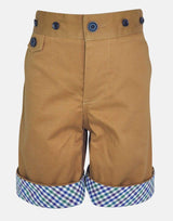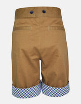 Smart stone cotton shorts with navy stripe braces. With contrast buttons, and trimmed with a contrast check, these shorts can be worn turned up or down, dependent on your style. With an adjustable waist for comfortable fit and waist pocket detail, these shorts are a versatile choice.
