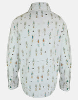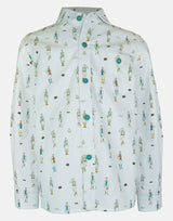 Our unique gentleman print on 100% cotton for this long sleeve smart shirt. With contrast two tone buttons to placket and cuff that bring out the teal and orange print, this off white shirt is the ultimate in British style. Complete with a chest pocket for those extra important Little Lord essentials.