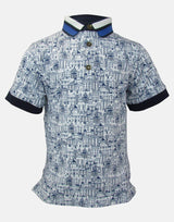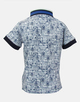 Our smart navy and white short sleeve polo shirt showcases our signature London skyline print. Trimmed with a navy, blue & white stripe collar and navy cuffs, the fabric is easy to care for and hard wearing.