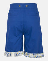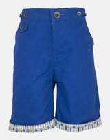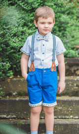 Vibrant blue cotton shorts with our unique Banksy print trim and navy braces for that quintessential British style. Pockets to front and back for those special boy things. These lovely shorts come with an adjustable waist to ensure a trim fit. Turn up or wear down, they are versatile and comfortable.