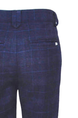 Navy plaid check in cobalt blue for these tailored trousers with our maroon fabric to match the Admiral bow tie in the turn ups and lining trim. There are pockets to front and back and an adjustable waist to ensure a trim fit. Remember our trousers have 3% elastane for that bit of stretch to ensure a good fit, but also to prevent tears and mis-shape from the rough and tumble of boys play.