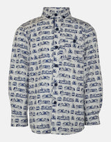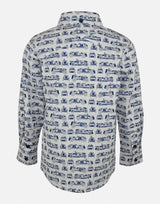 Thick white cotton with out unique vintage car print for this cotton long sleeve shirt. Trimmed with navy buttons and a chest pocket, this print is exclusively designed for this story. For every car mad Little Lord, this is the quirky choice for every day occasions.
