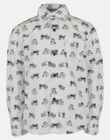 Our unique vintage bike print in olive and browns for this thick cotton fabric for a long sleeve shirt & bowtie. With contrast buttons in dark brown and a chest pocket perfect for Little Lord essentials, this shirt is a smart option for those everyday occasions.