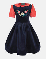 A sweet two piece including pinafore and blouse. This soft & thick navy velvet pinafore is fully lined with a mustard cotton and has a full skirt of petticoats in navy blue underneath. The bib is embroidered with a unique floral design which is a feature of this collection. The straps have adjustable fastenings for a comfortable fit along with a gathered skirt which makes the most of this luscious fabric and offers great twirling opportunities.