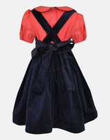 The coral blouse brings out the colour in the floral embroidery. With a navy piped Peter pan collar, this blouse is fastened at the back with fabric covered buttons. Lined to the body in 100% coral cotton, the sweet puff sleeves finish this lovely set, creating a clean shape and line.