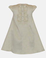 Esme is a beautiful, heavy cream jacquard with gold sparkle woven into the fabric. Trimmed with pleats at the front to create a strong silhouette, this dress is finished at the nape with a part gold button back and frill. With cap sleeves and A-Line style, this dress is the perfect Christmas outfit.