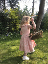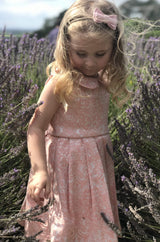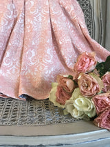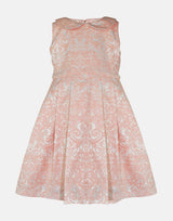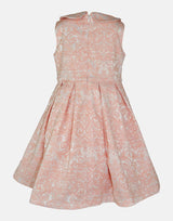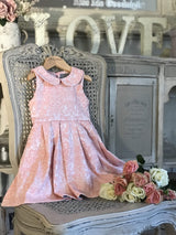 A sweet sugar pink jacquard on a cream sateen in a sophisticated occasion dress. With a neat, sleeveless body, Peter Pan collar, the skirt has two front pleats, leaving a flat central panel giving a sleek finish. Underneath our signature pettiskirts in off white create a full effect. Fully lined for comfort and finished with a hidden zip to the back, this is a very special dress.