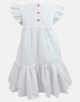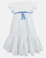 The Tilly frill sleeve white dress is simple and delicate with a subtle texture to the fabric for that elegant British Style. A round frill neckline tops this tiered dress. The empire is trimmed with a fixed bow and band in blue. The lower skirt is gathered for extra twirlability. Fully lined for comfort, the dress is finished with a part button back with contrast buttons for easy changing.