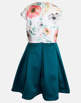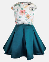 The Aria coral poppy print and jade satin for this elegant dress. A fitted floral body in a stretch satin with sweet cap sleeves and a Peter Pan collar give the dress a certain British style. Flowing into a deep solid colour satin box pleat skirt, the lashings of deep green net underskirts offer twirlability and fun. Fully lined in 100% cotton for comfort, the dress is finished with a hidden zip to the back for easy changing. The Aria coral poppy unique print is a light oversized flower in corals and peach, with complementary greens and creams highlighted by the deep skirt colour. A beautiful dress, simple and elegant, with a matching Aria coral poppy headband to create the look.