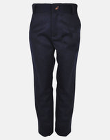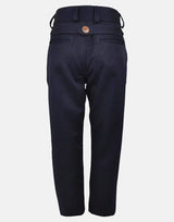 Super smart, navy tapered trousers in a rich wool blend fabric for that special occasion where only the best will do. The fabric has a tiny blue spot woven in and is cut in tailored jib to look like a true dapper gent. The trousers have belt loops and are trimmed in a pale blue cotton to the pocket lining and waist. Pockets to the front and back are handy for boys at an event and an adjustable waist to ensures their comfort as well as a trim fit. Last but not least, the contrast seam piping to the turn up offers that extra bit of pizazz! Remember all our trousers have 3% elastane for that bit of stretch to ensure a good fit, but also to prevent tears and mis-shape from the rough and tumble of boys play.
