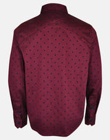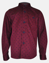 A new style in this 100% cotton, burgundy with navy spots long sleeve grandad shirt. Look just like Dad with this grandad collar and smart shirt. With navy buttons and a neat pocket to the chest, this shirt has placket seam features and is lined to the collar and cuffs with our blue woven fabric and a burgundy velvet tape. Contrast with our Cobalt blue trousers for an ultra cool style.