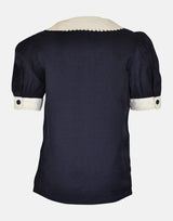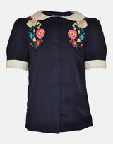 A classic navy blouse with a cream Peter Pan collar and cuff, complete with our unique floral embroidery detail that runs through this collection. The collar and cuffs are edged in cream lace, which contrasts with the navy cotton of the blouse and create a sweet yet striking effect. A simple blouse with the intricate details, lined to the body and finished with short puff sleeves.