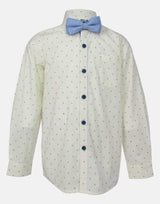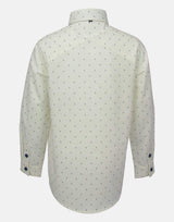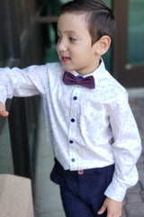 A cotton long sleeve shirt in white with a silver grey diamond pattern. Complete with sky blue bow tie, this smart shirt is highly versatile. The trim is a pale blue contrast fabric for cuff, collar and button placket, with navy buttons and a chest pocket for those special Little Lord necessities.