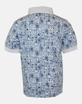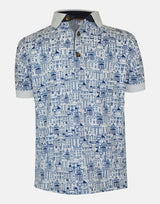 A smart, white polo in our signature London skyline print in blue. With a striped collar and white ribbed cuffs, this polo shirt is perfect for dressing up or down.