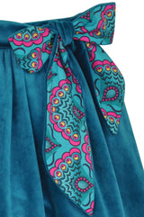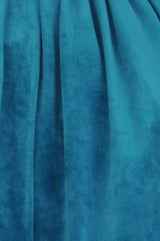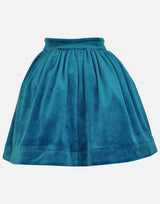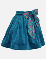 A luscious super soft teal velvet for this striking skirt. With a velvet tie at the waist trimmed with our unique Evangeline print for contrast. The gathered skirt sits over lashings of pettiskirt for fullness and twirlability. Fully lined in cotton for comfort.
