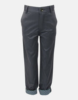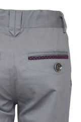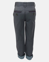 Silver grey for these smart trousers with our Michael print fabric to the turn ups and lining trim. There are pockets to front and back and an adjustable waist to ensure a trim fit. Remember our trousers have 3% elastane for that bit of stretch to ensure a good fit, but also to prevent tears and mis-shape from the rough and tumble of boys play.